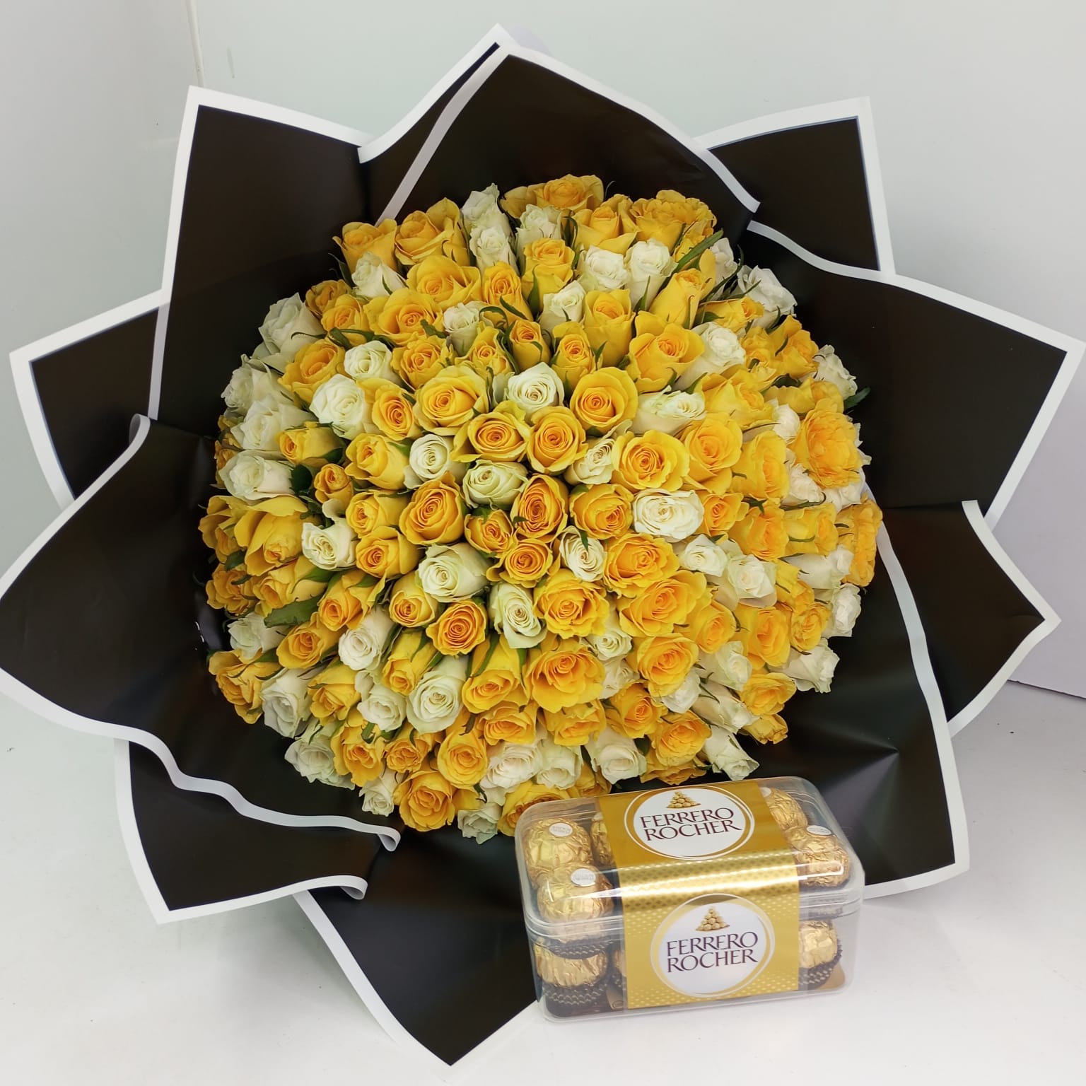 This combo features a bouquet of 100 yellow with white roses accompanied by ferrero 16pcs chocolates, which is a perfect gift for girlfriend, wife or someone whom you truly love.