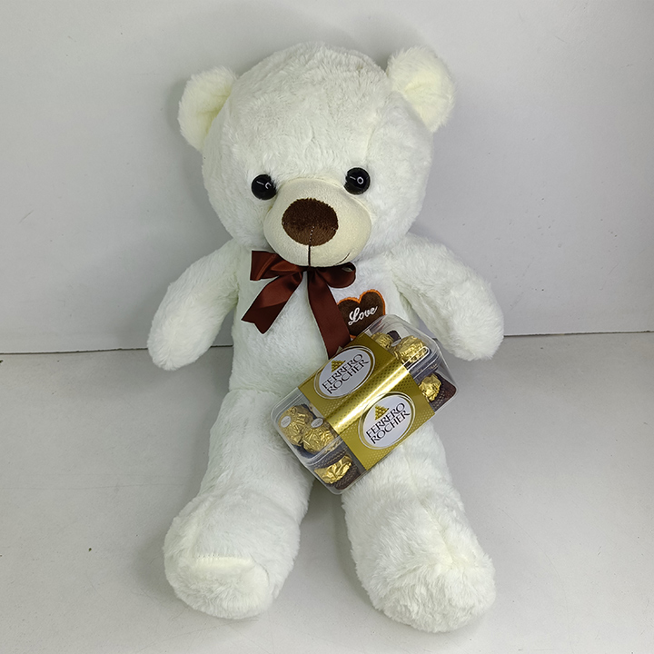 Surprise someone you love with this romantic gift which consists of a 60cm white teddy bear and a box of ferrero rocher 16pcs chocolates pack. Make someone smile with this cute gift!