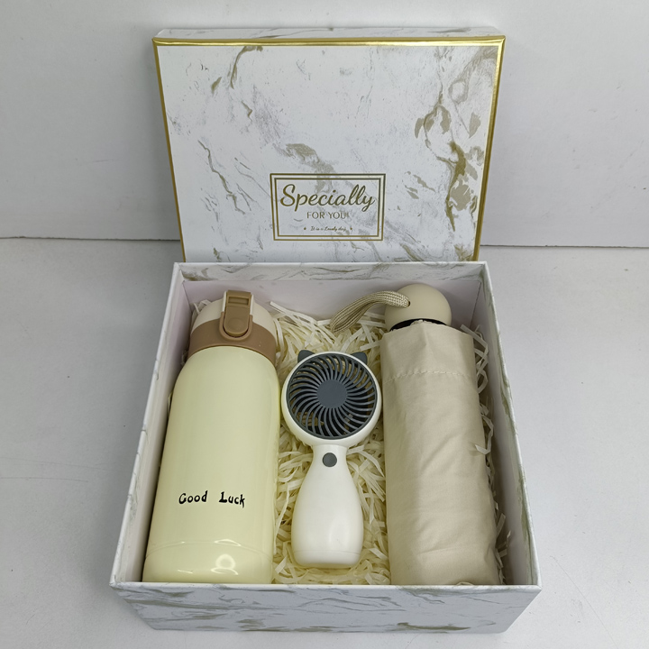 A cute gift set for her, contains a water bottle, an umbrella and a rechargeable cooling fan.