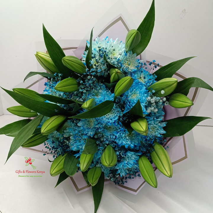 A hand-tied bouquet with lillies, blue chrysanthemums and perfectly hand-tied makes a beautiful gift for him.