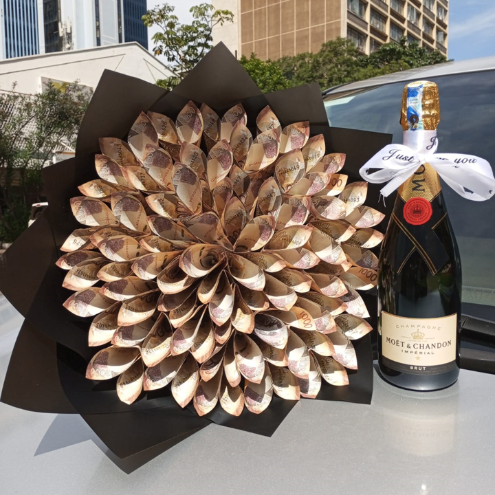 Make a statement with this one-of-a-kind bouquet, which is a truly beautiful flower money bouquet. It contains perfectly arranged KSh 1,000 notes, accompanied by Moet & Chandon Imperial Brut champagne (750ml) which makes it a perfect romantic surprise for her.