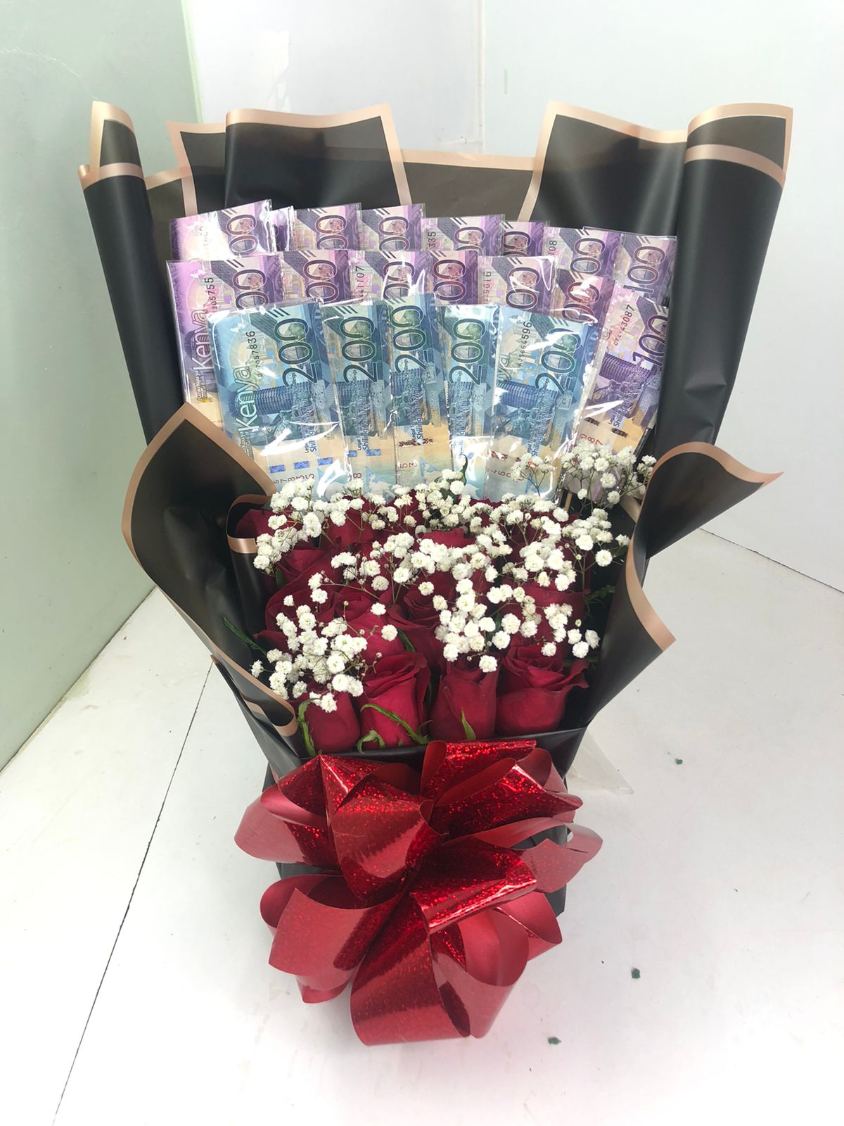 Surprise someone in a fun & unique way with this one-of-a-kind flower money bouquet. This bouquet features perfectly arranged red roses paired with KSh 50 & 100 notes for a truly stunning look.