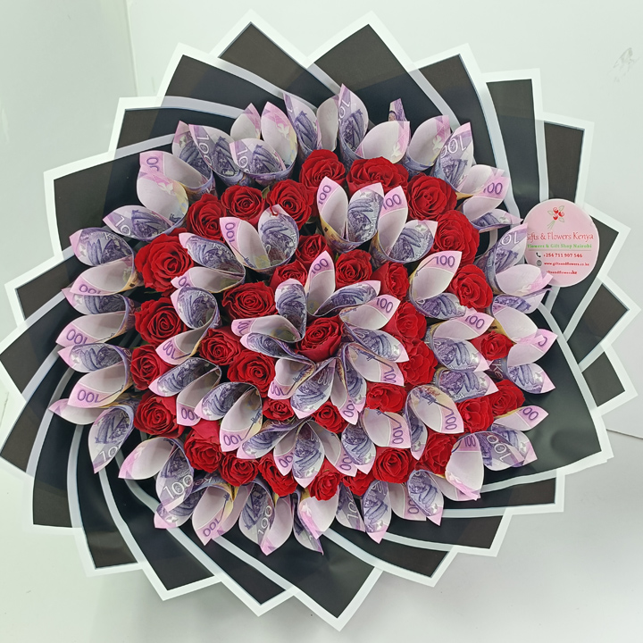 A truly beautiful flower money bouquet featuring perfectly arranged red roses paired with KSh 100 notes, which makes it a perfect romantic surprise for her.