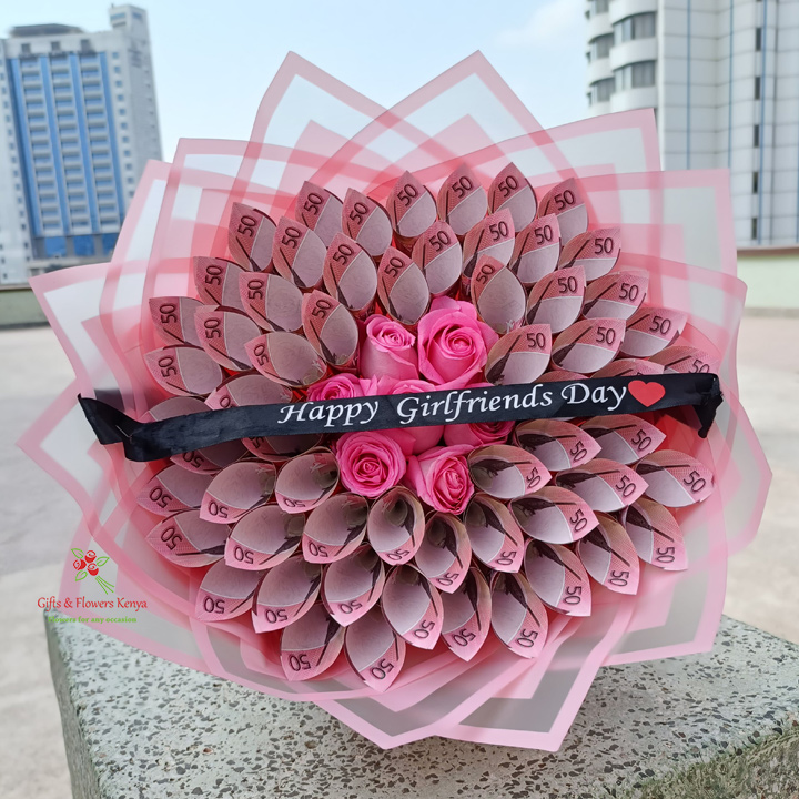 Surprise her with this one-of-a-kind girlfriend’s day romantic flower money bouquet. This bouquet features perfectly arranged pink roses paired with KSh 50 notes for a truly stunning look.
