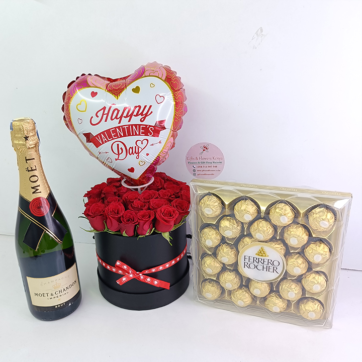 This combo contains; a hat box bouquet of red roses, ferrero rocher 24pcs chocolates, and Moet & Chandon Imperial Brut champagne (750ml).